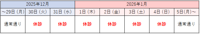 当院は、2025年12月30日(火曜日)から2026年1月4日(日曜日)まで休診となります。