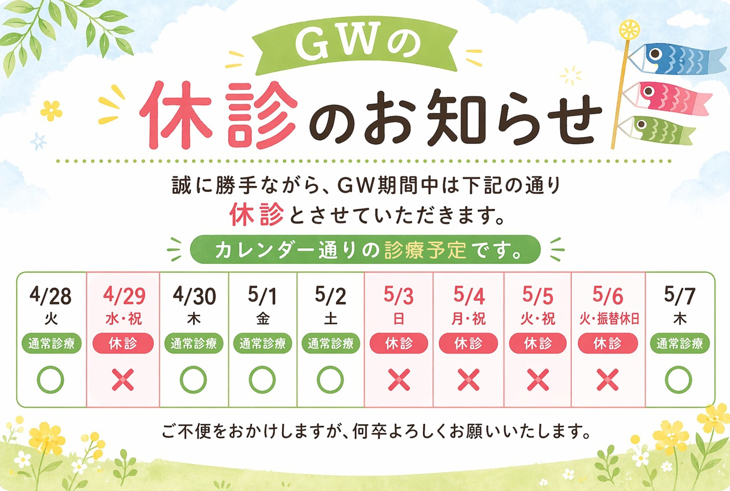 🎏ゴールデンウイークの診療日について 2026.04.23 当院はカレンダー通りの診療予定です。 祝日の4/29(水).5/4(月).5(火) 振替休日の6(水)は終日休診ですのでご注意ください。 おたふくかぜの予防接種について 前の記事